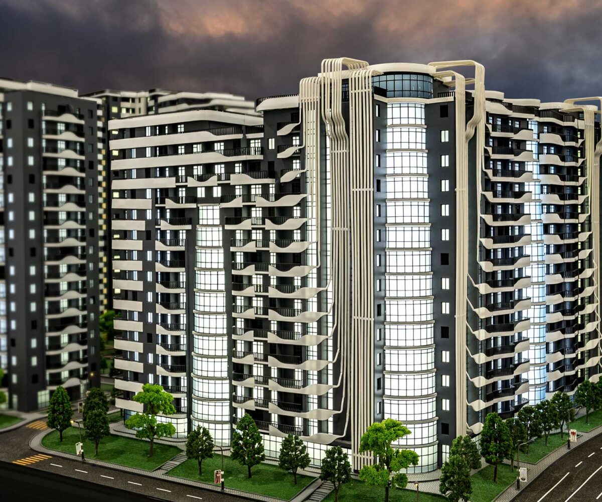 We presents AVAN TOWERS residential microdistrict. It occupies an area of 120,000 m2, and 48,000 m2 is fully planned for a green park, where thick trees, 9 playgrounds, and recreation areas will be available. The microdistrict will also have helipads. It consists of 4 blocks, each block with 8 apartment buildings, a total of 5200 apartments, 3500 parking spaces, public spaces.High-class elevators will be installed in each building of the district.